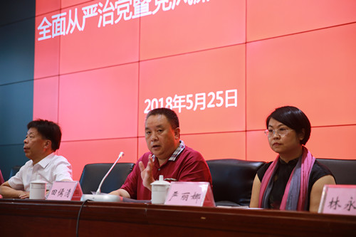 他就我校推进全面从严治党,加强党风廉政建设工作提出5点工作要求:一是提高政治站位,用习近平新时代中国特色社会主义思想武装头脑,指导实践,推动工作;二是深刻认识推进新时代全面从严治党的重要性、必要性和紧迫性,推进全面从严治党持续纵深发展;三是认真履行“两个责任”,推动管党治党、办学治校主体责任落到实处;四是纠“四风”树新风,持续推进作风建设;五是加强廉洁教育,持续正风肃纪。