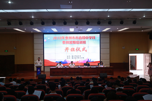(宣传部记者 杨丹宇 陈镇灏)7月3日上午,2018年惠州市市直初中学科教师暑假培训班在我校明德书院学术报告厅举行开班仪式。市教育局邓凡用副局长、继续教育科梁敏副科长,市直初中近200名教师学员出席了开班仪式。我校邓庆宁校长,李立高副校长和相关部门人员参加了仪式。