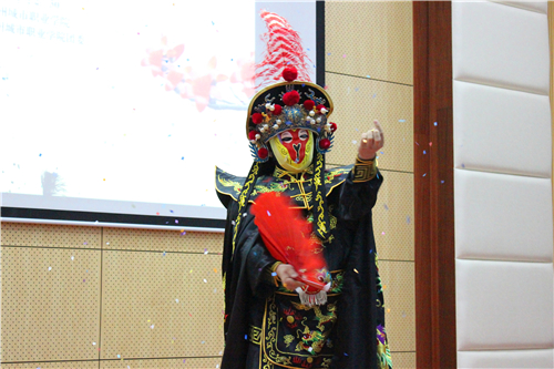 蒋力老师首先对昆曲的起源及发展历程娓娓道来,随后姜兴发老师与姜小菁老师共同演绎经典昆曲《牡丹亭游园惊梦》片段。二人惟妙惟肖的动作、细腻的空谷之音,对舞台深厚的掌控力博得现场师生不断拍手称赞。冯婷婷老师一首古筝名曲《渔舟唱晚》,温柔委婉,让人不禁想起诗人李白的“清筝何缭绕,度曲绿云垂”。邓伟浩老师的京剧变脸将活动推向了高潮,为台下观众带来了一次惊叹的视觉盛宴。